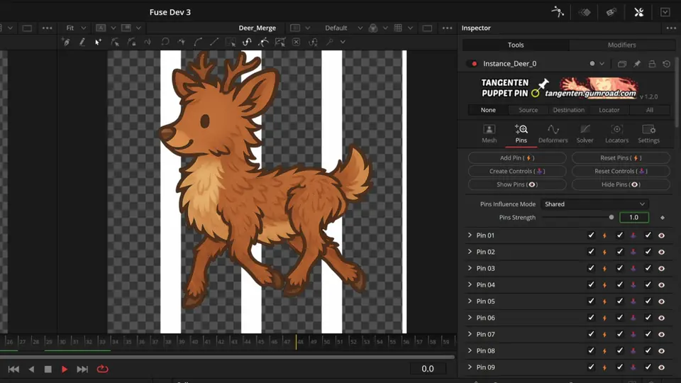 Built to support a multi-layered workflow, this deer was separated into six layers in the free image editing program Affinity, then exported as a layered .psd file. Each layer was animated in DaVinci Resolve, all controlled by a single rig for all six layers using instanced Puppet Pin nodes!