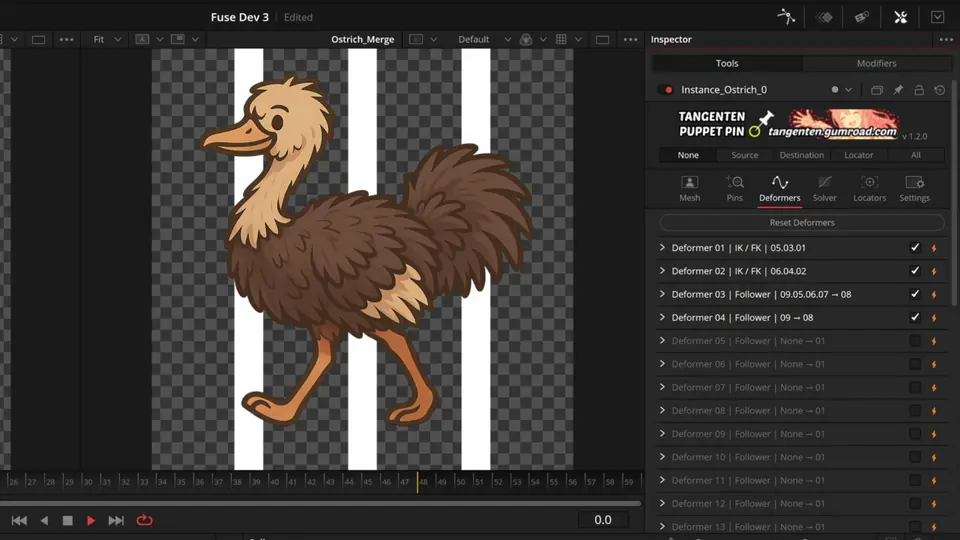 The head of this ostrich is animated with two follower deformers, both tracking the movement of pin 8. One controlling motion along the X axis and the other along the Y axis but with different amplitudes and delay creating a smooth, looping bounce.